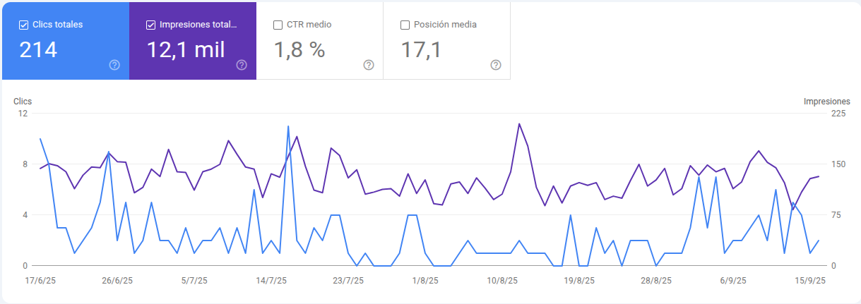 Este primer gráfico presenta las impresiones y clics generados por el portal durante el período de seguimiento, mostrando un total de 12,1 mil impresiones. Esta cifra evidencia el interés sostenido de los usuarios en las búsquedas y consultas dentro del sistema, así como la efectividad de la plataforma para ofrecer resultados relevantes y accesibles en tiempo real.